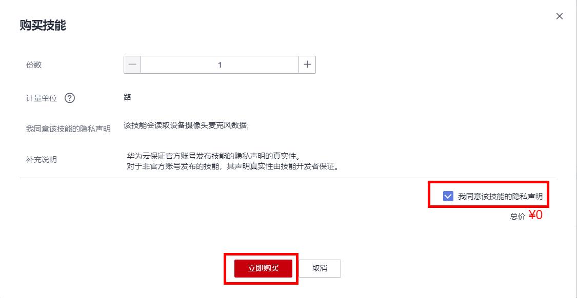 在弹出的购买确认窗口中,勾选同意隐私声明,点击“立即购买”: