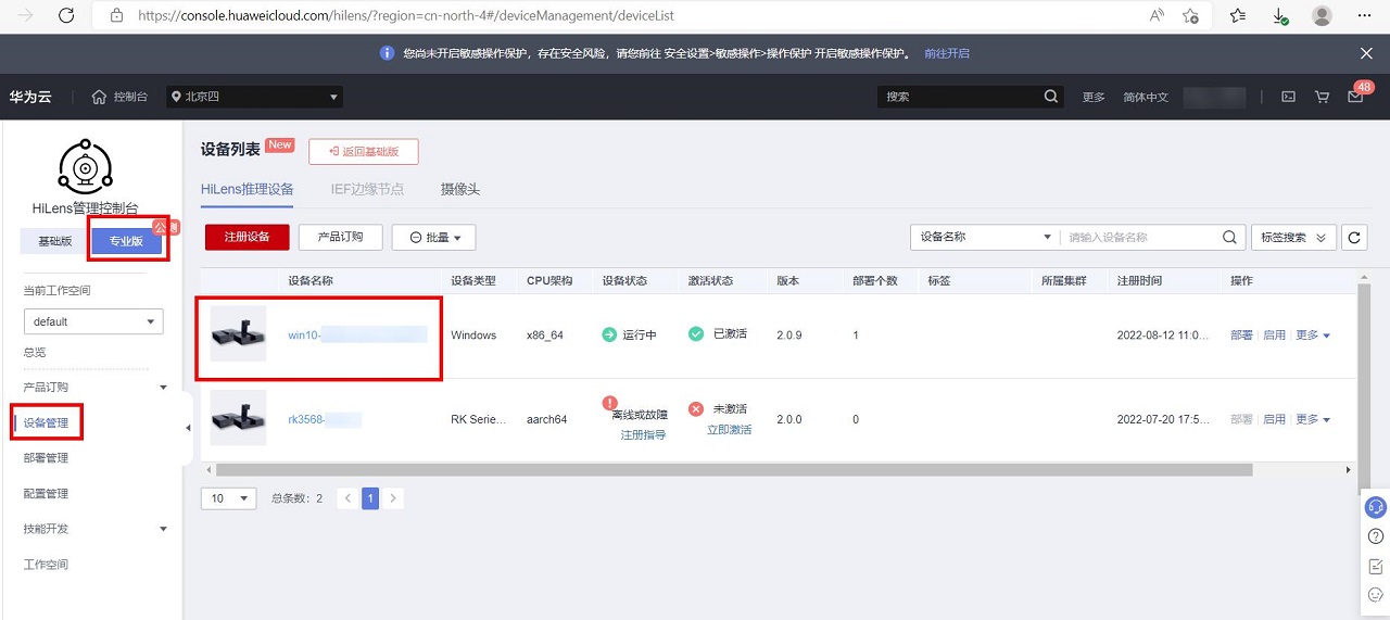此时,进入HiLens管理控制台专业版的设备管理页面,点击部署技能的设备: