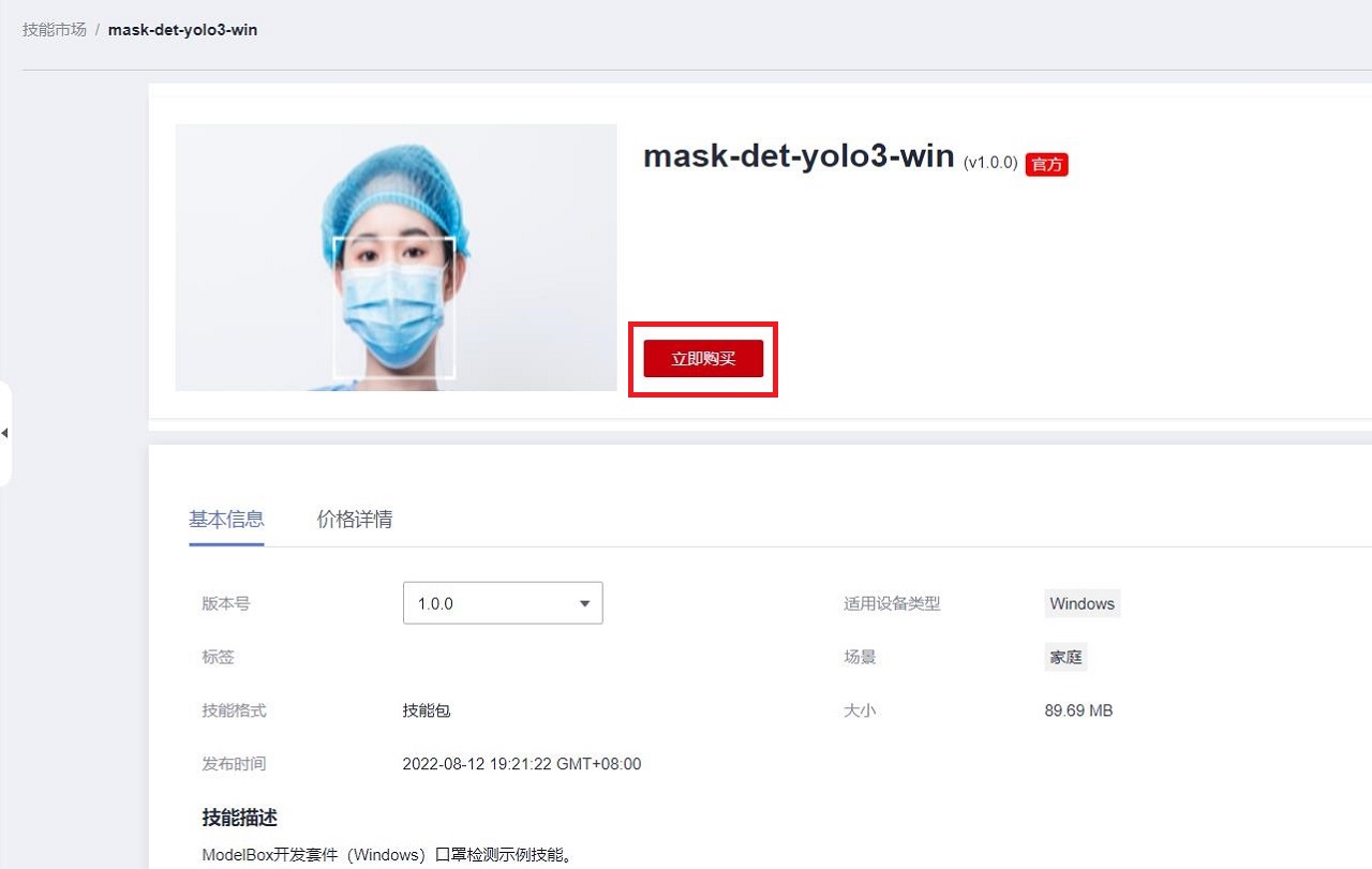 在口罩检测技能的详情页面,点击立即购买: