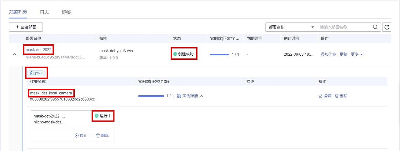 进入“设备详情”页面,在下方的“部署列表”区域,将会看到创建好的部署和运行中的作业,可以在作业区域对作业做编辑、停止、启动、删除等操作,也可以添加新的作业,或者删除部署等: