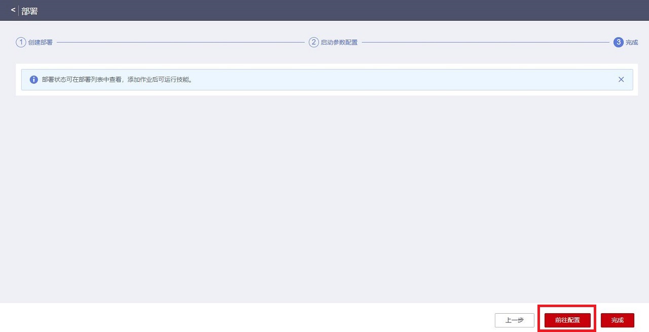 点击“下一步”,进入部署第三步页面,注意,此时若点击“完成”只是完成了技能部署,还没有启动技能,因此,我们点击“前往配置”按钮,去配置任务: