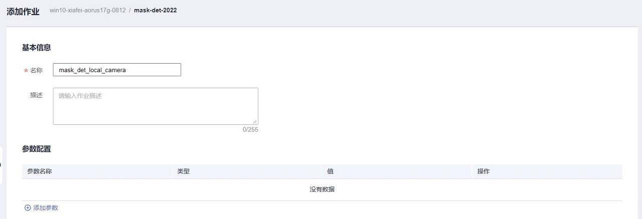 创建好部署只是启动了ModelBox服务,此时还需要添加作业才能启动技能,在添加作业页面可以看到已有作业名称: