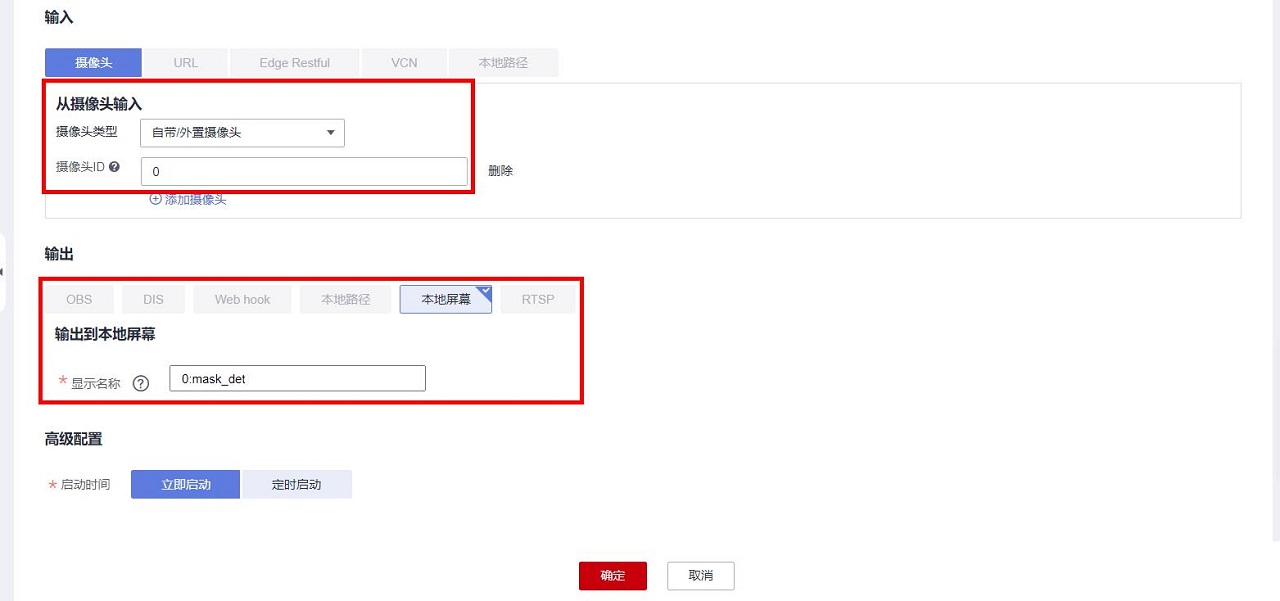 口罩检测示例技能使用的是设备自带或者USB接入的摄像头,检测结果输出到本地屏幕上,因此在输入配置中,选择“从摄像头输入”,摄像头类型为“自带/外置摄像头”,摄像头ID为“0”(若有多个摄像头,可以用不同的ID选择不同的摄像头);输出配置中,选择“输出到本地屏幕”,任意填写一个“显示名称”,如“mask_det”: