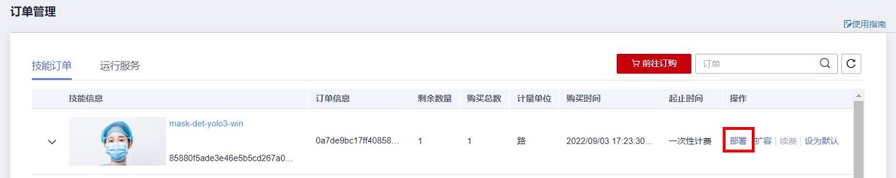 此时,将自动跳转到订单管理页面,可以看到刚刚购买的口罩检测技能: