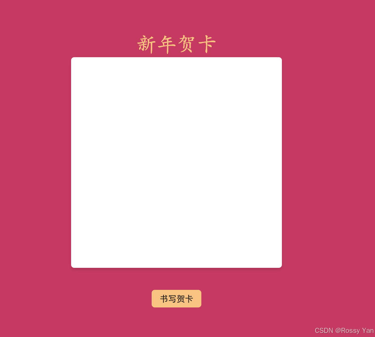 div class="card-name":一个带有card-name类的div元素,用于显示 “新年贺卡” 字样。div class="card" id="card":一个带有card类和id为card的div元素,代表贺卡的主体部分。p id="greeting-display":一个p元素,用于显示贺卡的祝福语,它的内容将通过 JavaScript 动态添加。button id="btn":一个带有id为btn的按钮,点击该按钮将触发书写贺卡的操作。script src="./index.js":引入外部的 JavaScript 文件index.js来实现动态交互功能。