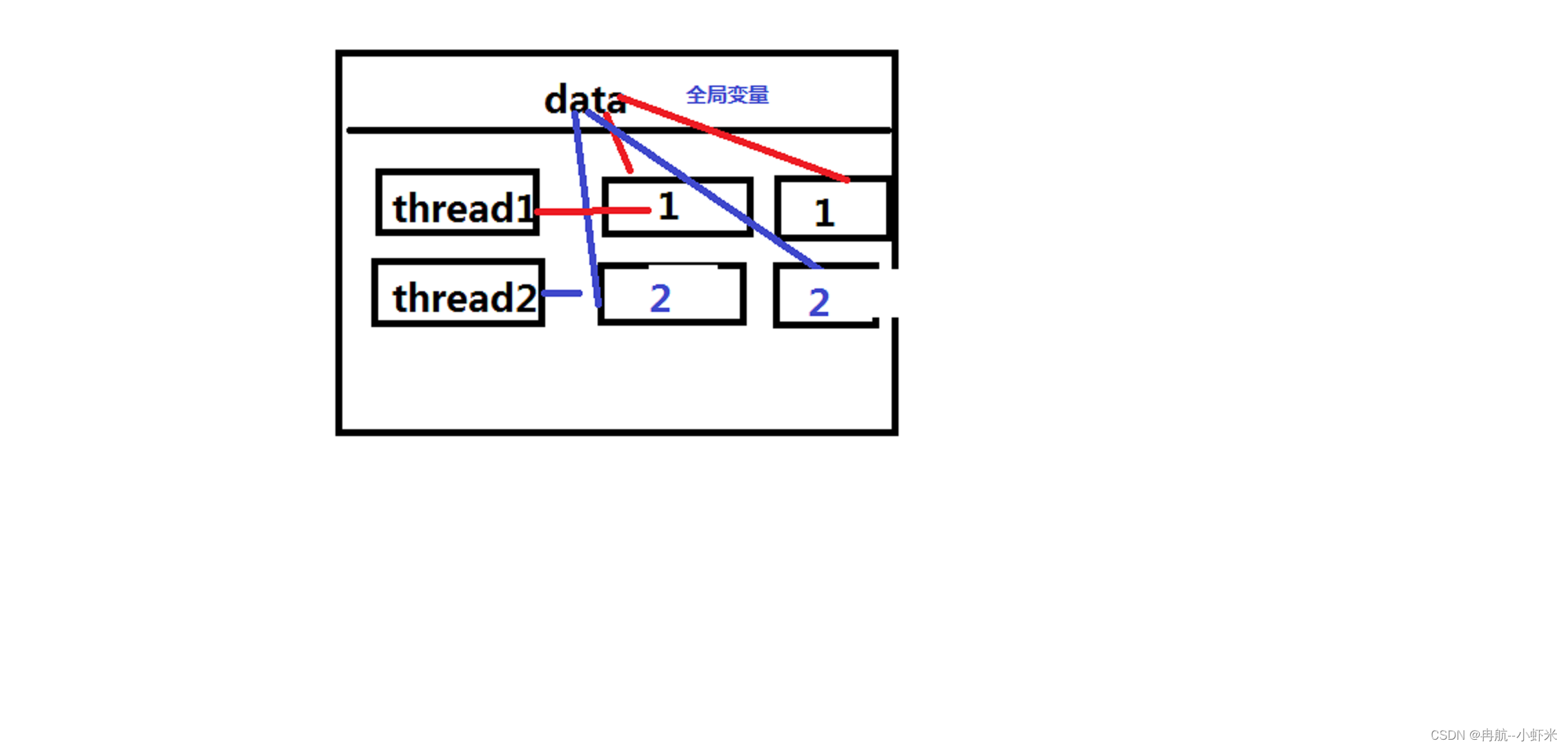 假设有2个线程,一个全局变量 int data。2个线程内的代码共用这一个变量的声明(data),但它们操作data时,data的值在这2个线程里是独立的,互不影响的。我们这里所说的互不影响,不是我们之前说的syncronized,(线程1先修改data值,读取data值,释放锁后,线程2才可修改data和读取data,这样的话data最终的值还会变为线程2最后修改的值)。我们现在要实现的是,线程1修改了data=1, 线程2也修改了同一个data变量的值为2,data=2,最后线程1回过头再去读取时,读取出的data应该是1(它自己当时放的值就是1),线程2回头再去读取data时,读取的也是它自己的值,2. 这个data是2个线程的共享变量,但它的值在2个线程范围内各自是独立的。如下图所示: