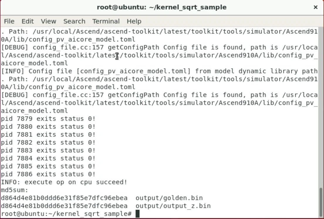 使用numpy的allclose()函数比较算子计算与基准数据的结果。实际上由于npu模式编译出错,实际未执行改函数进行比较。CPU模式下,算子计算出的结果与基准golden数据完全一致,两者的md5相同。