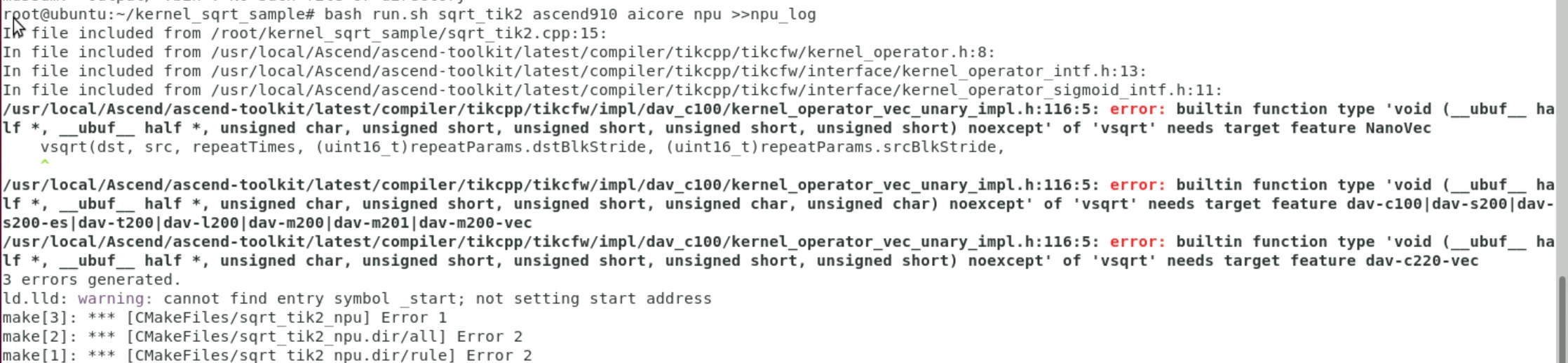 前言:编写一个Ascend C的sqrt算子,并通过内核调用方式在cpu和npu模式下进行验证。在训练营沙箱环境下,cpu模式工作正常结果正确,npu模式下编译报错,以后有机会再研究。