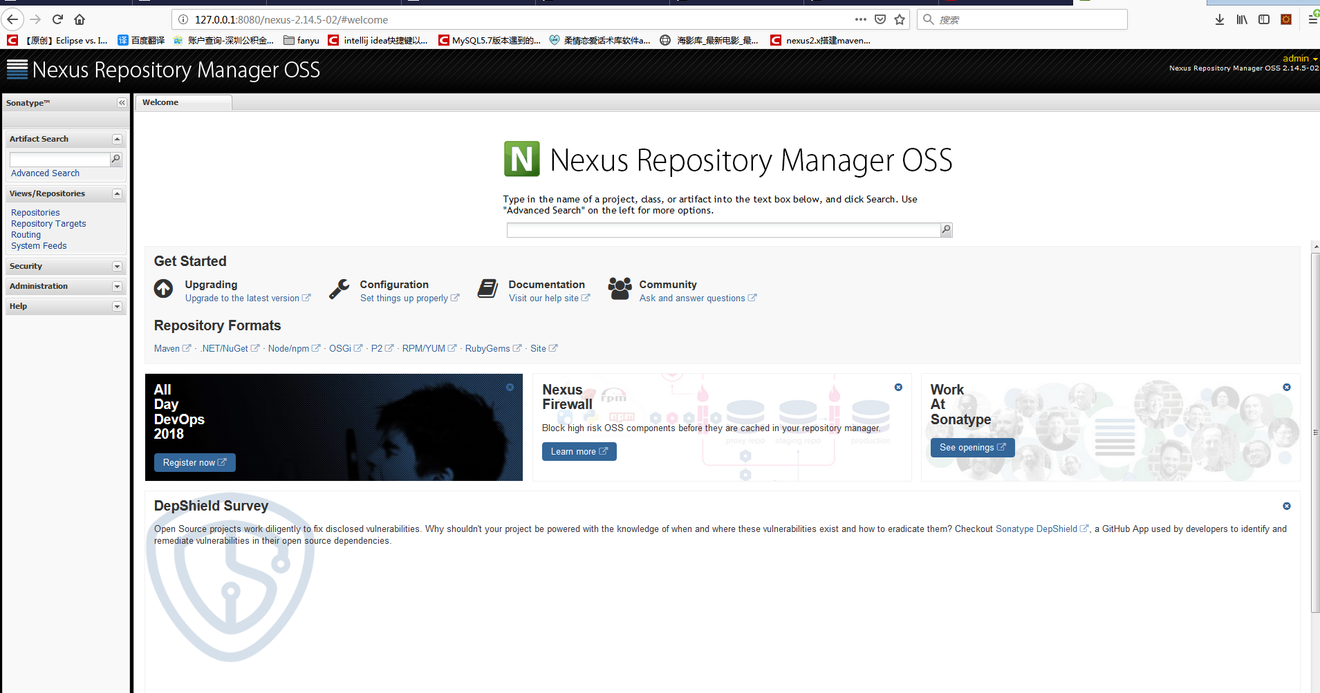 2、接下来是配置,在浏览器访问:http://127.0.0.1:8080/nexus-2.14.5-02,进入主页