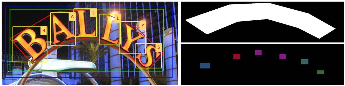 左图:蓝色框表示区域候选网络生成的文字区域候选框;红色多边形和黄色包围 框分别 表示真值多边形文字实例框和字符框;绿色框表示覆盖多边形的最小水平矩形区域。右图:上图表示文字实例分割的真值;下图表示字符分割的真值。