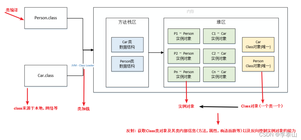 每个类都会有一个与之对应的Class实例,从而每个类都可以获取method反射方法,并作用到其他实例身上;