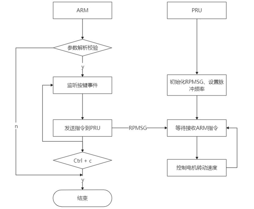 案例功能:PRU根据ARM传输的数据内容,控制电机驱动器的PUL和DIR管脚来调整电机的转速和转动方向。ARM通过监听按键事件,然后通过RPMsg传输频率数据至PRU,从而控制电机的转动速度。