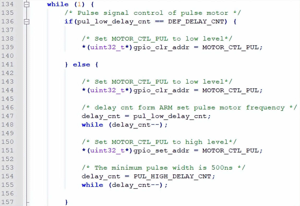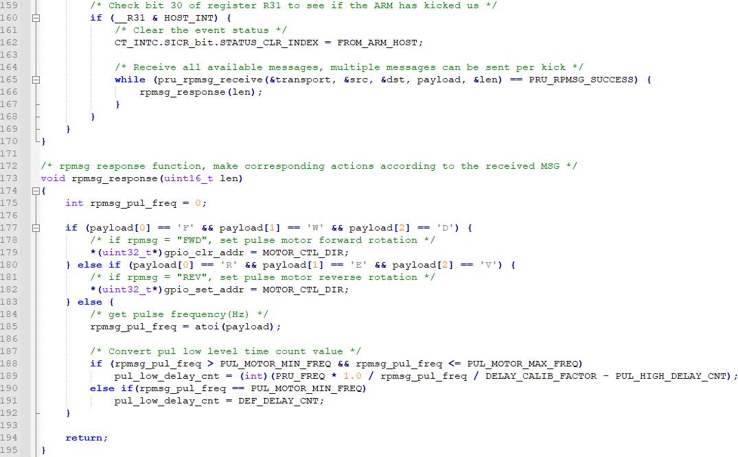 等待ARM通过RPMsg发送数据,PRU根据数据内容控制电机驱动器的PUL和DIR管脚来调整电机的转速和转动方向。