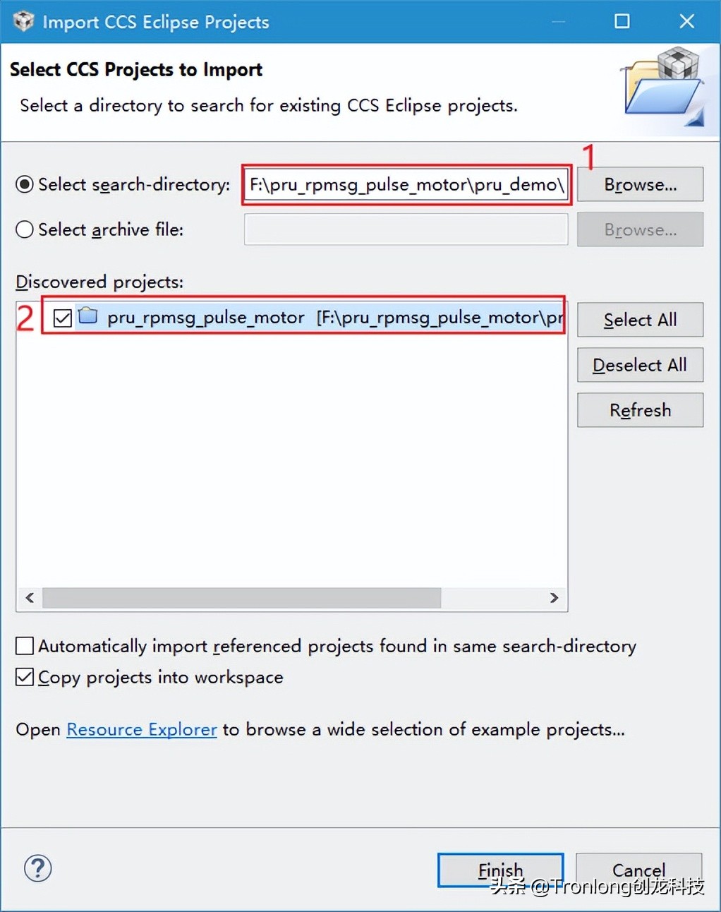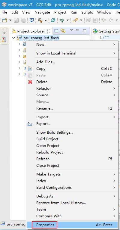 请将“4-软件资料\Demo\PRU-demos\pru-icss-5.1.0.zip”压缩包解至CCS7.4.0安装目录,右击工程后点击Properties选项,重新指定PRU案例的头文件和库文件路径。