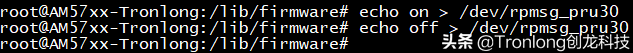 Target# echo on > /dev/rpmsg_pru30 //点亮LED