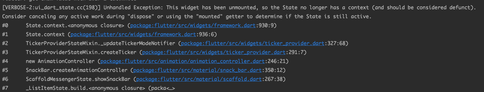 这种情况下我们只能保证Item 不可见的时候 SnackBar 还能正常弹出, 而如果这时候我们直接退出页面,还是会出现以下的错误提示,因为 ScaffoldMessenger 也被销毁了 。