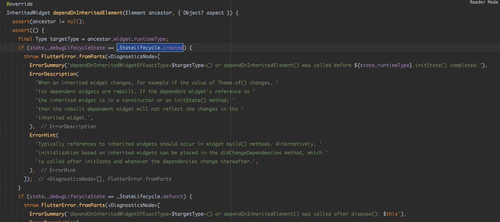 这是因为 Element 里会判断此时的 _StateLifecycle 状态,如果此时是 _StateLifecycle.created 或者 _StateLifecycle.defunct ,也就是在 initState 和 dispose ,是不允许执行 of(context) 操作。