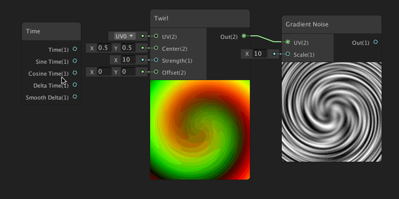 通过Twirl 旋转节点对Gradient Noise 梯度噪声节点进行操作,就可得到一个旋转的旋涡效果。