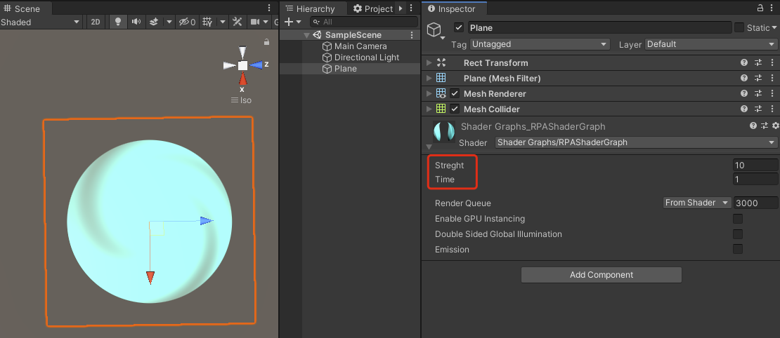 最后一步,创建“Plane”将其材质赋值为上面创建的材质球,可以得到最终效果,这时我们可以编辑之前设置好的“Streght”和“Time”属性的值,就可以直接调节想要的效果了:
