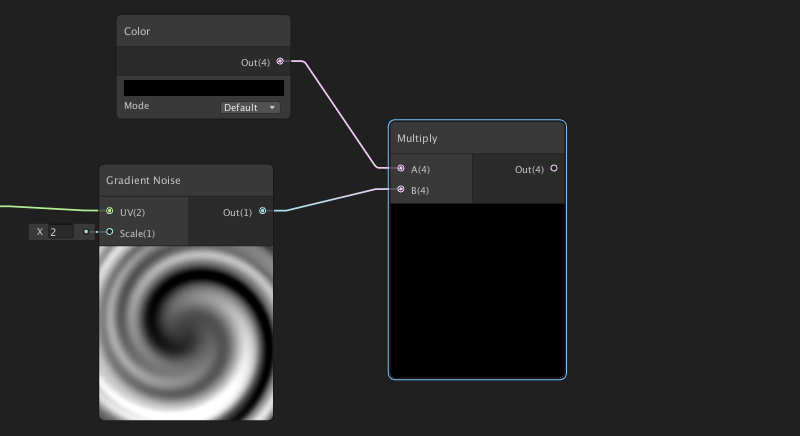 创建“Color”颜色节点 和 “Multiply”乘法节点,我们将“Gradient Noise”节点的输出 和 “Color”颜色节点的输出都连接到“Multiply”乘法节点的输入上: