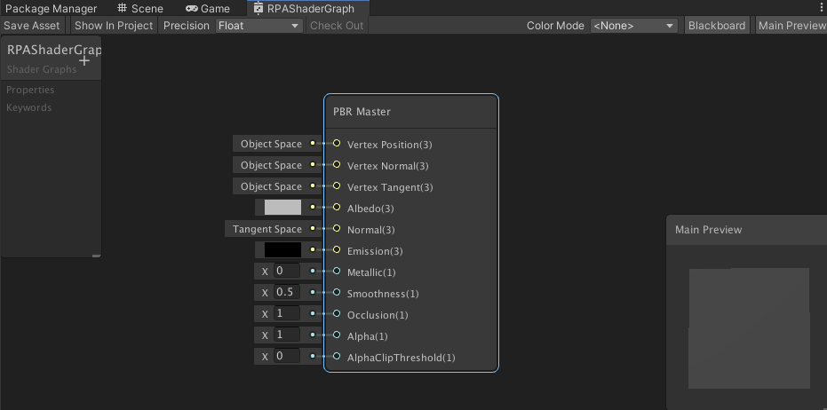 在“RPA Graph” 编辑界面右上角,点击“Save Asset” 保存一下。然后创建材质球,将其材质选定为刚刚保存的这个“RPAShaderGraph”。