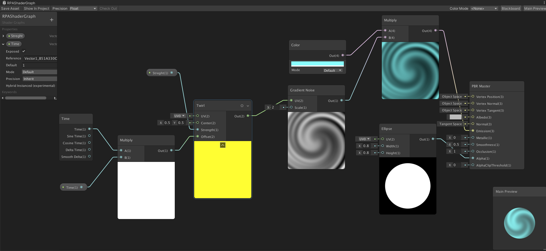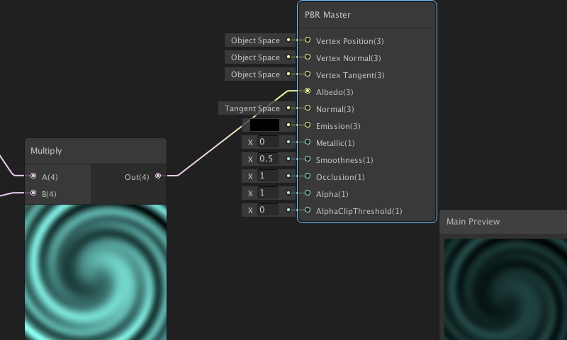 接下来,将带有颜色旋涡的“Multiply”乘法节点输出,连接到”PBR Master”主节点的Albode输入上,即可在预览图上看到旋涡的效果上了: