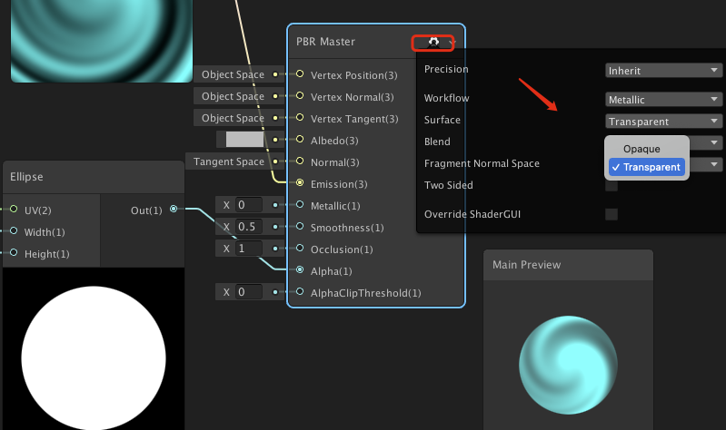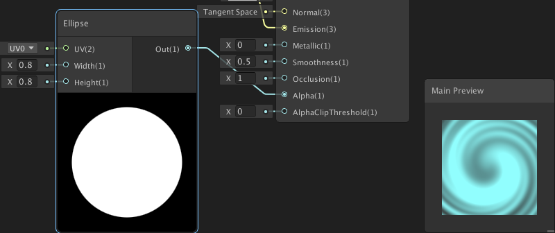 添加一个圆形的遮罩不就行了:添加“Ellipse” 圆形节点,将其输入节点的宽高调整为0.8,然后将输出节点,连接到”PBR Master”主节点的Alpha输入上: