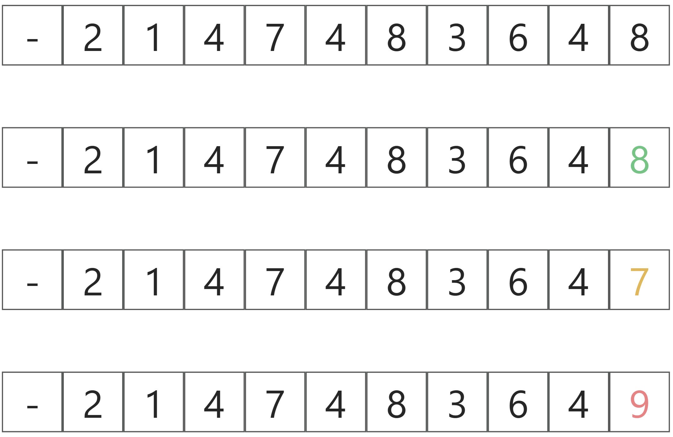此时,需要满足TMP*10+original<INT_MAX-1,与负数那种情况的运算方法一样,求出original<7