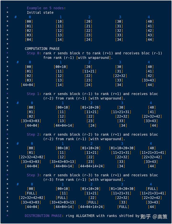 我们可以静态地指定算法,也可以让 OpenMPI 来决定。当然,这不是这篇文章的重点。在深度学习这一场景下,被最为广泛应用的是 RingAllReduce 这一实现。在 OpenMPI 中,这一实现在 ompi/mca/coll/base/coll_base_allreduce.c。它的注释非常简洁明了地介绍了实现原理,建议阅读。简单来说,它利用了 MPI 的端到端通信的原语,实现了 RingAllReduce 的功能。将 RingAllReduce 分为了两个阶段。第一个阶段等价于 MPI_ReduceScatter 的语义,是将结果计算到不同的进程。第二个阶段等价于 MPI_AllGather 语义,将计算结果聚合到所有进程。