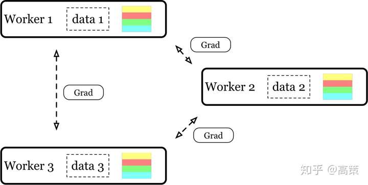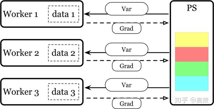要理解它们之间的关系,首先要介绍一下模型训练。在一次模型训练中,首先我们会利用数据对模型进行前向的计算。所谓的前向计算,就是将模型上一层的输出作为下一层的输入,并计算下一层的输出,从输入层一直算到输出层为止。根据目标函数,我们将反向计算模型中每个参数的导数,并且结合学习率来更新模型的参数。在分布式训练的场景中,这一问题就会更为复杂一些。比如我们利用 4 个 Worker,利用不同的数据同步地训练相同结构的模型(数据并行的同步训练),在每个 Worker 计算好梯度后,就涉及到一个梯度同步的问题。每个 Worker 都有根据自己的数据计算的梯度,如何能够让自己得到的梯度也能作用于其他的 Worker 呢?有一种方式,是引入一个中心化的组件,参数服务器。所有的参数都存储在参数服务器中,而 Worker 是万年打工仔。Worker 们只负责辛辛苦苦地计算梯度,并且把计算好的梯度发送给参数服务器。参数服务器收到梯度后,执行一定的计算(梯度平均等)后,更新其维护的参数,再把更新好的新参数返回给所有的 Worker。Worker 打工仔们会再进行下一轮的前后向计算。