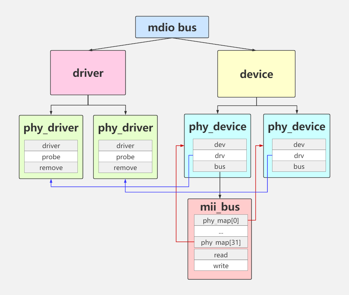 针对mii management,抽象为struct mii_bus;针对phy设备,抽象为struct phy_device;针对phy设备的驱动,抽象为struct phy_driver ;mdio_bus为总线类型。