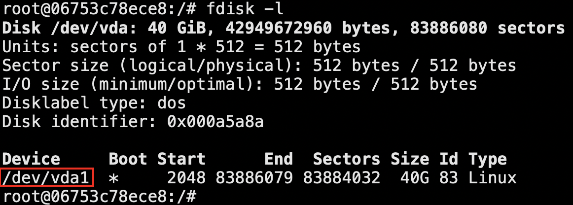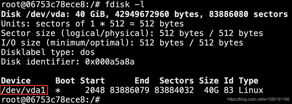 3.fdisk -l命令查看宿主机设备为/dev/vda1,通过mount命令将宿主机根目录挂载进容器