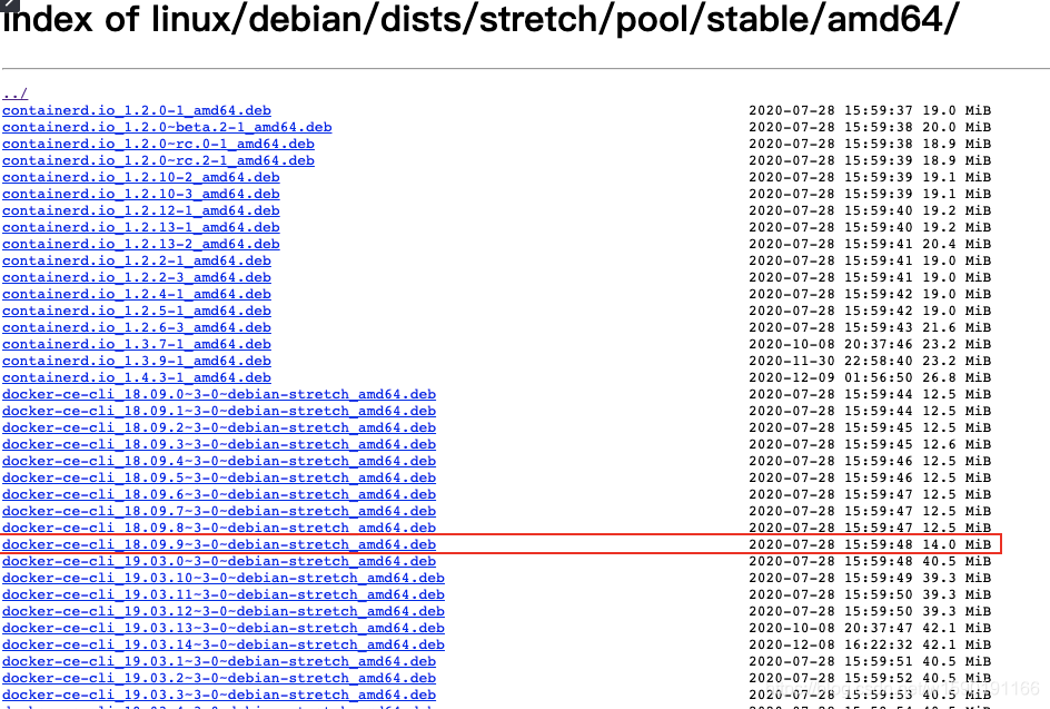 4. 访问https://download.docker.com/linux/debian/dists/,根据选择具体分支,如stretch就去https://download.docker.com/linux/debian/dists/stretch/pool/stable/amd64/下载.deb结尾的安装文件 使用这种方式安装的好处是容器内一般都缺少很多基础组件,如果通过apt-get安装实测20分钟也装不完