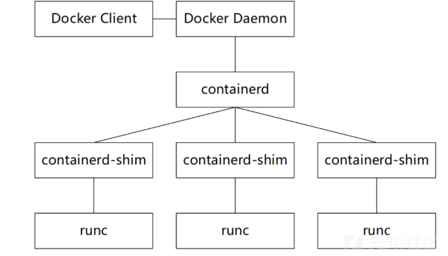2. docker架构图如下,其中对普通用户来说,最为熟悉的就是最外层的docker client和docker daemon,一个是docker命令行工具,另一个是dockerd后台进程。containerd则为docker和run的一个沟通