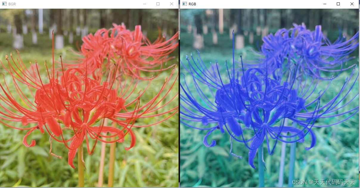 编写程序,先拆分通道,再分别按照BGR的顺序和RGB的顺序合并通道。