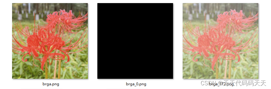 虽然在代码中调整了BGRA图像中A通道的值,但是显示图像的效果是一样的。为了显示这3幅图的不同效果,需要用方法将这3幅图像保存到磁盘上,代码如下:
