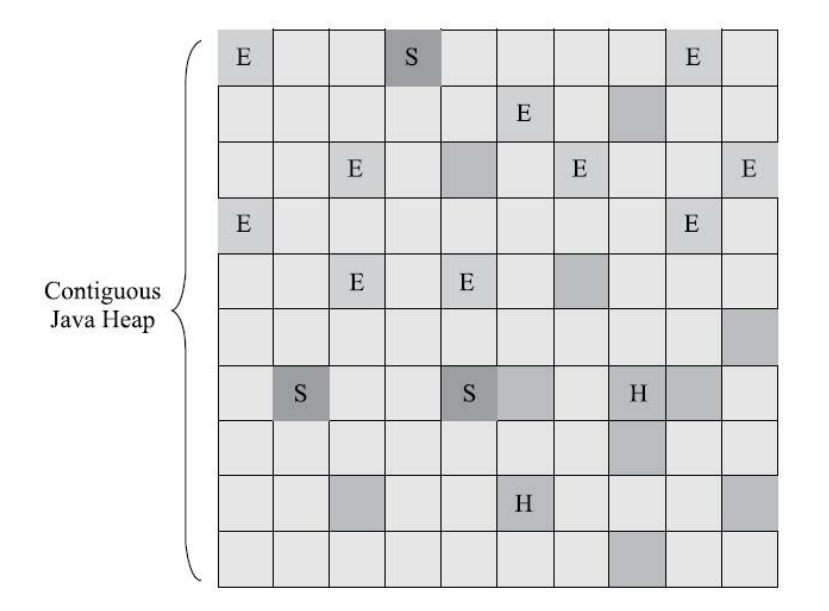 Region中还有一类特殊的Humongous区域,专门用来存储大对象。G1认为只要大小超过了一个Region容量一半的对象即可判定为大对象。每个Region的大小可以通过参数-XX:G1HeapRegionSize设定,取值范围为 1MB~32MB,且应为2的N次幂。而对于那些超过了整个Region容量的超级大对象,将会被存放在N个连续的Humongous Region之中,G1的大多数行为都把Humongous Region作为老年代的一部分来进行看待,如下图(G1收集器Region分区示意图)所示: