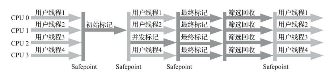 通过下图(Concurrent Mark Sweep收集器运行示意图 )可以比较清楚地看到CMS收集器的运作步骤中并发和需要停顿的阶段: