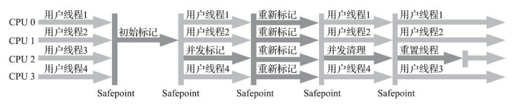 三、重新标记阶段则是为了修正并发标记期间,因用户程序继续运作而导致标记产生变动的那一部分对象的标记记录(详见3.4.6节中关于增量更新的讲解),这个阶段的停顿时间通常会比初始标记阶段稍长一些,但也远比并发标记阶段的时间短;