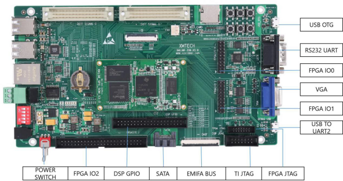 开发板引出丰富的外设,包含千兆网口、SATA、EMIFA、uPP、USB 2.0 等高速数据传