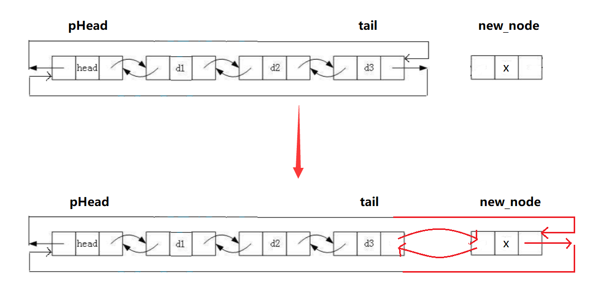 ② 因为要实现尾插,我们要找出尾部节点。我们这里并不需要像之前学单链表时需要创建寻尾指针找到尾部节点,直接从 pHead->prev 那里取就可以了。是不是非常的方便?找都不用找了直接 O(1) 解决,真的是不爽不要钱!随后创建新节点,直接调用我们刚才写的 CreateNewNode 接口即可。