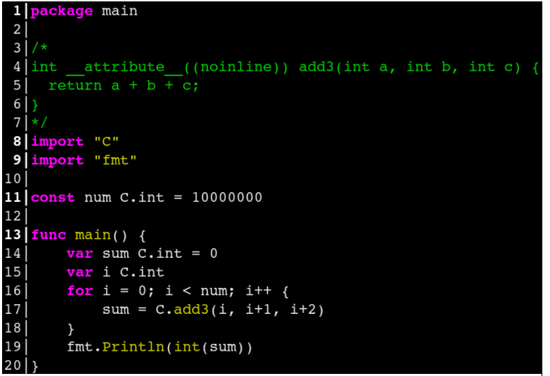 GO调C基本原理CGO是实现Go与C互操作的方式,包括Go调C和C调Go两个过程。其中Go调C的过程比较简单。对于一个在C中定义的函数add3,在Go中调用时需要显式的使用C.add3调用。其中C是在程序中引入的一个伪包。示例代码如下所示:图一:CGO使用示例代码 代码中的import “C”即为在Go中使用的伪包。这个包并不真实存在,也不会被Go的compile组件见到,它